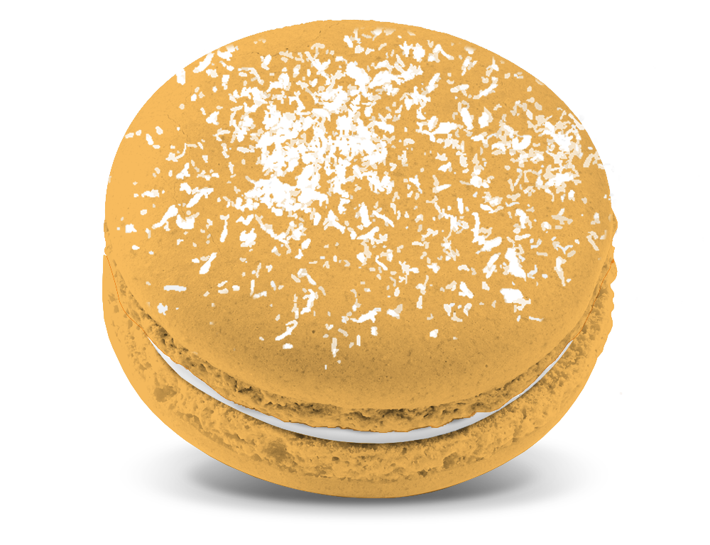 Tészta: Mandula 29%, kristálycukor, porcukor, tojásfehérje, ivóvíz, citromsav-monohidrát, színezék: E1711, E422, kókuszreszelék Töltelék: Ganache: Fehércsokoládé 50% (cukor, kakaóvaj, teljes tejpor, emulgálószer: szójalecitin, természetes vanília aroma), kókusz gyümölcspüré 30%, tejszín, glükózszirup, kókuszreszelék Passió gyümölcs kompót: passió gyümölcs magokkal 79%; cukor; víz; sűrítőanyagok: citrom rost, szentjánoskenyér-liszt; zselésítő anyag: gyümölcs pektinek; citrom és acerola-lé koncentrátum.